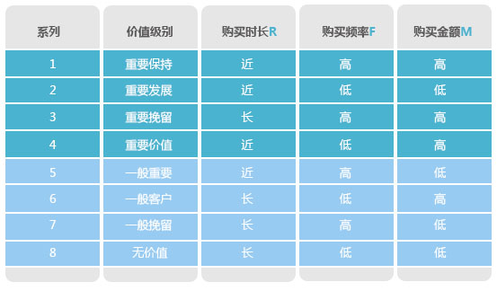 將消費者按照最近消費時(shí)間、消費頻次、客單價(jià)等維度劃分為重要保持、重要發(fā)展、重要價(jià)值、重要挽留、一般重要、一般客戶(hù)、一般挽留、無(wú)價(jià)值這8類(lèi)消費者。